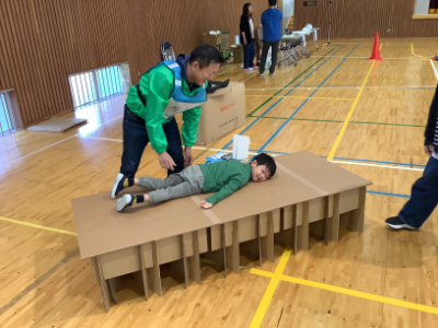 体育館でも、様々な体験が行われました。これは毛布を使った応急担架づくり体験です。実際に担架を持ってみると人間の体重の重さをズシッと感じます。