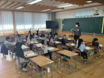 1年生の国語の授業です。誰かが教室の前を通っても授業への集中が途切れません。国語の教科書の内容についての先生の質問に子どもたちが元気に答えていました。