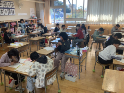 4年生は、算数の問題に挑戦です。グループで教え合うなどしています。1クラス学年の絆がこのような学習に生かされています。でも、「親しき仲にも礼儀あり」を忘れないでこれからもいい関係を築いてくださいね。