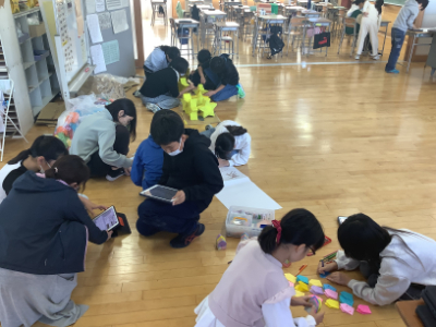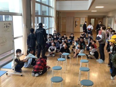 1階のフロアには5年生が。下校する1年生が、「何しているの?」と尋ねてきます。これは明日の「就学時健診」の打合せです。1年生が入学してきた時の6年生、つまり現5年生がお手伝いを行います。1年生の皆さんに就学時健診の時のことを聞くと「覚えてる!」と元気なお返事が。あの時の5年生(現6年生)から手を引いてもらって校舎を回ったことは、確実に今につながっています。