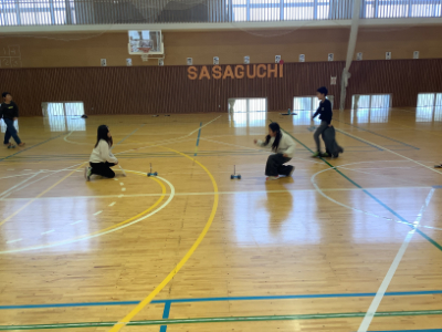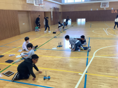体育館からは、にぎやかな声が聞こえてきます。体育の授業かな?とのぞいてみると、3年生が理科で作った自動車を走らせていました。