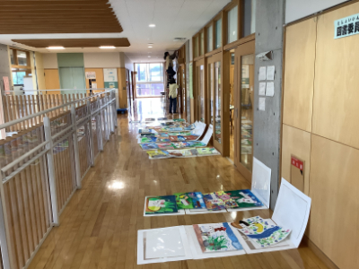 15分休みの前には、廊下に絵が並べてあるところもあるので、注意して歩くように放送が入りました。
