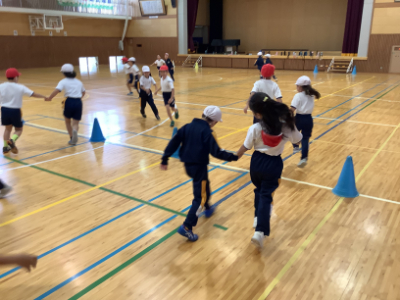 2年生は体育館で体育です。ペアで手をつないで先生の笛の指示で、走ったりスキップをしたり止まったり座ったりしています。「笛2回は何だっけ?」とっさに判断しなければならないので頭も使います。