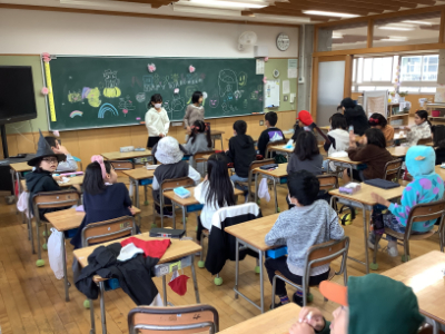 4年生は、朝からとても楽しみにしていた「ハロウィンパーティー」です。仮装をしている人もいます。伝言ゲームや魔女ゲームなどをして楽しんでいました。