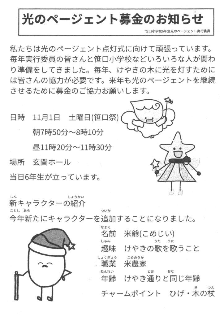 6年生は、光のページェント点灯式の準備が着々と進んでいます。本番までの計画を立て作業を少しずつ積み重ねています。点灯式が近づいていますが、光のページェント実行委員会の目標の運営金額に到達していない現状があります。明日も、下のお知らせの通り、6年生が募金に取り組みますので、ご協力をよろしくお願いします。