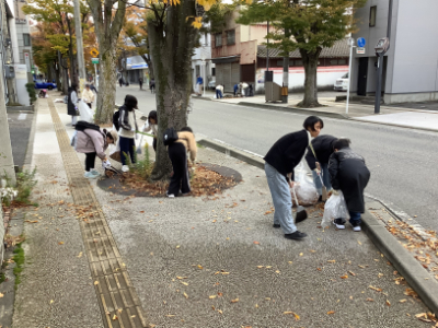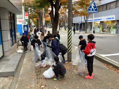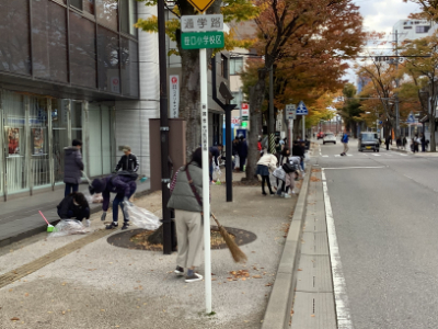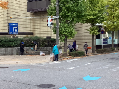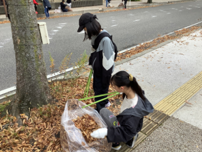 そしていよいよけやき通りのクリーンアップ作戦です。6年生は、木曜日にけやき通りのお店などにポスター掲示の依頼に行きましたが、その時もゴミ拾い活動を行っています。今日は落ち葉の清掃中心の活動になりました。