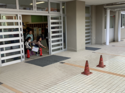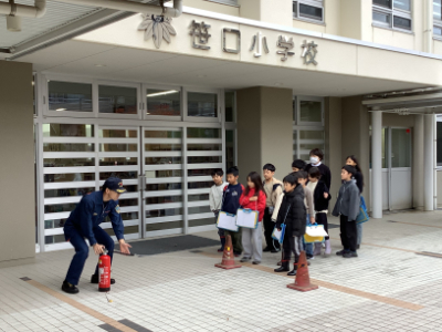 そして、3年生は、新潟市消防局の方からご来校いただき、リトルファイヤースクールを行いました。子どもたちはいくつかのグループに分かれて様々な体験をしました。これは、玄関前で行った水消化器を使った訓練です。