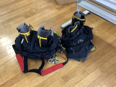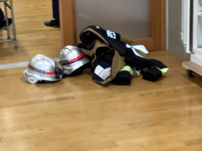教室では、消防のお仕事の話や防火服の着用体験も行いました。
