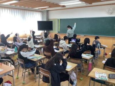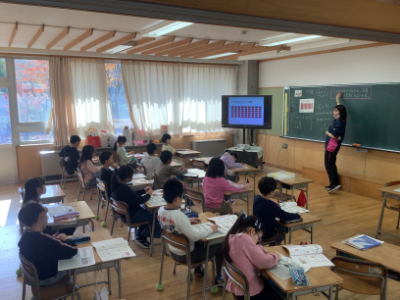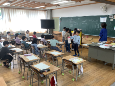 4年1組は、新しい漢字の学習です。まず、漢字ドリルを見ながら、「様々な読み方」「その漢字を使った例文」などを代表の子が読み、次に空中にその字を書いて書き順のイメージを持ち、実際に漢字ドリルに漢字を書いてみます。「空中書き」なんて言ったりしませんでしたか?