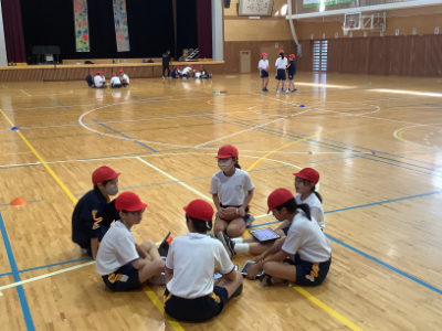 5年1組の体育は、フラッグフットボールです。5年生は、Tボール、タグラグビーなど、様々なゲームを楽しんでいます。今日はチーム名を考え、作戦を練っていました。