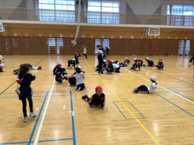 金曜日の5時間目の様子です。1年生は体育館にいました。この度の寒波で体育館もこれまでより冷え込んでいますが、1年生は元気いっぱいです。学年での「動物ランド」です。