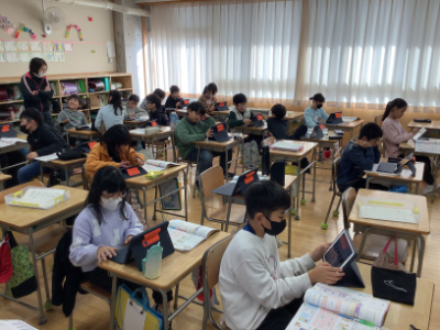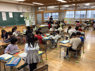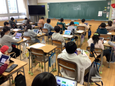 5年2組はタブレットに向かって個人作業です。家庭科の学習で「買い物の仕方」について考えていました。おもむろに「今欲しいものありますか?」と聞かれたので「先日破れた長靴」と答えました。夢がない回答だったので反省です。