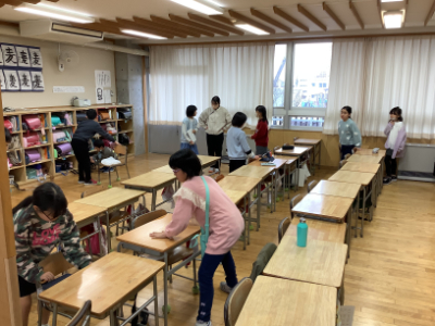 2年生も学年で集まっています。こちらは、モルモットのお世話の仕方などについてグループでまとめています。1年生との引継ぎ式の準備です。