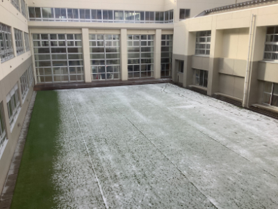 昨日と今日の寒波で中庭にはうっすらと雪が積もっています。中庭は人工芝なので雪がすぐにはとけません。ここで雪遊びをするのはいつごろになるのでしょうか。