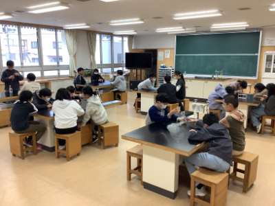 6年1組は教室で理科の学習をしていましたが、後半は理科室に移動して実験です。時間があまりなくても速やかに移動してすぐに実験を始められるところが6年生です。炭酸水と石灰水を使った実験をしていました。