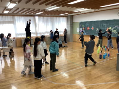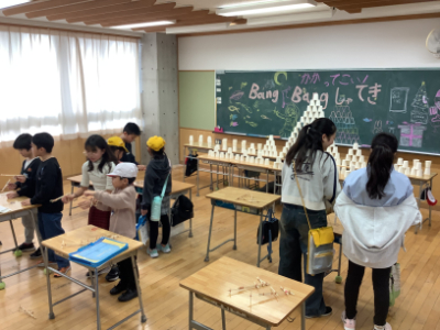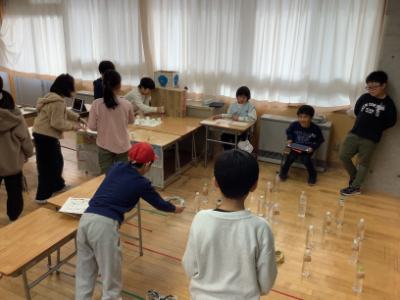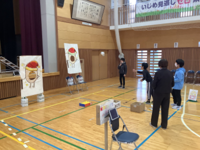 子どもたち手作りのゴム鉄砲で的をねらいます。ポイントが高いのは裏側のねらいにくいところにかくれていたり、的が小さかったりして工夫されています。しっかりねらって高得点をゲットしました!(ちょっと自慢)