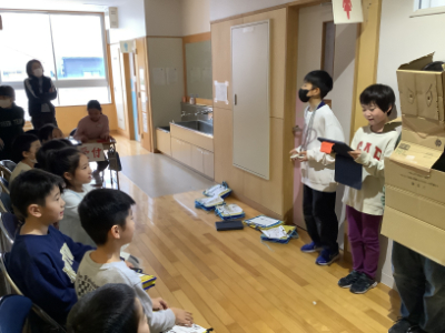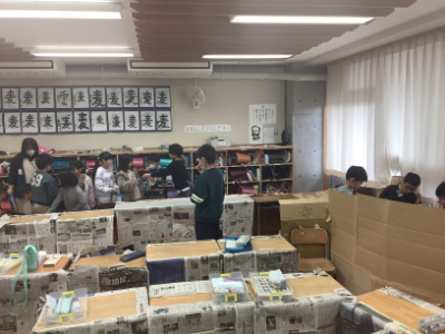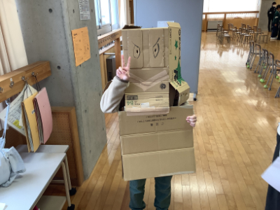 お店の宣伝で校内を回る5年生の段ボールマン!