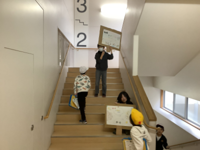 プラカードをもって校内を回る4年生!