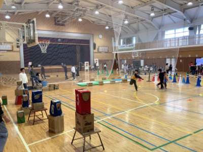各ポイントに様々なゲームが用意されているのですが、そのポイントに向かうための通路は、ほふく前進やひざ立ち歩きで移動しなければならず、なかなか体力を削られます。(私だけ?)