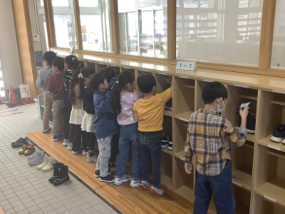 1年1組は、玄関の下駄箱の掃除をしていました。並んで下駄箱の中を清掃する姿がかわいらしいですね。