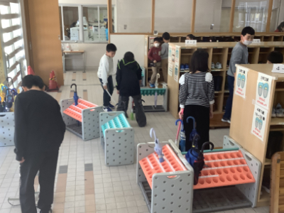 5年1組は、教室と下駄箱の清掃です。さすが5年生。下駄箱だけでなく、傘立てやすのこを移動しての清掃もしてくれていました。