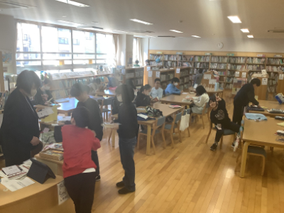 6年2組は、冬休みの本を借りていました。誰ですか?ピースをしているのは。冬休みを迎える喜びが素敵な笑顔に表れています。