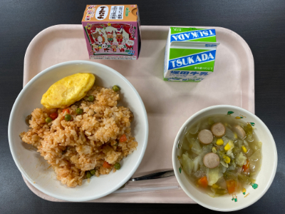 給食はクリスマスバージョンのメニューです。クリスマスデザートのケーキのクオリティが高かったとは子どもたち談です。