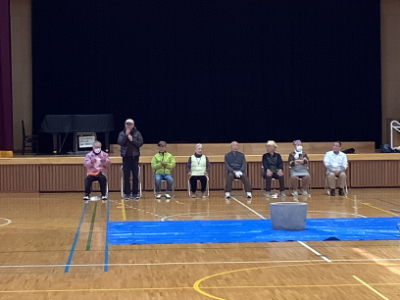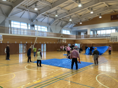 もちつき会場となる体育館にもマットやブルーシートを敷いて準備です。