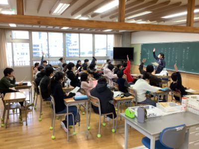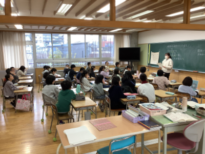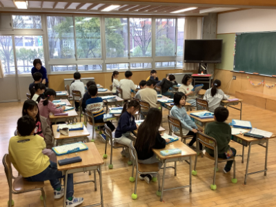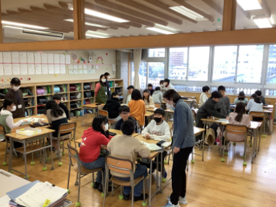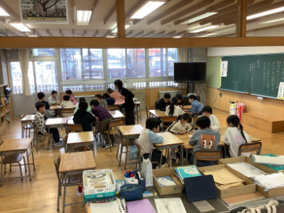 5年2組は、グループでになって「冬休み思い出すごろく」で冬休みを振り返っていました。クラスのあちこちから笑い声が聞こえてきます。ボランティアの学生さんもお手伝いをしてくださっていました。