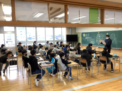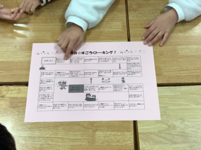3年1組は、「冬休みすごろくトーキング」です。2年1組はビンゴでしたが、こちらはすごろくです。学校生活の再開を楽しい活動で!という担任の先生の工夫がここでも見られます。