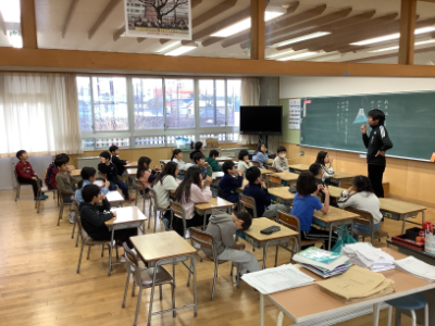 6年1組は、にぎやかに描かれた黒板の前で先生が元気にお話をしていました。先生の元気はやはり子どもにも乗り移りますね。いよいよ6年生は、小学校生活最後の3か月ですね。