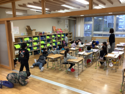 1年2組は国語です。かんざわとしこさんの「みみずのたいそう」というお話を体で表現していました。「ぴん ぴこ ぴん!」の声がそろっていてとてもかわいいです。