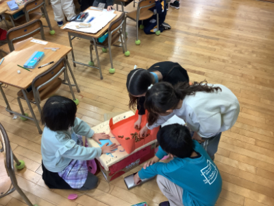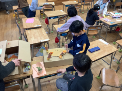 1年2組の生活科です。秋探しで集めた木の実や葉っぱを使っていろいろなものをつくっています。