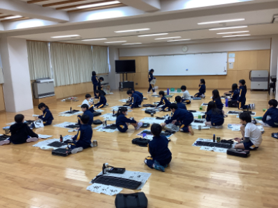 3年2組の書写は、多目的室で行われていました。長半紙に文字を書くため広いスペースが必要だからです。長半紙に「友だち」という字をうまく書けたでしょうか。