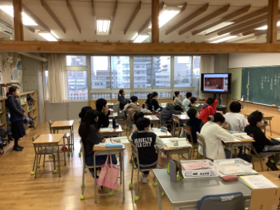 6年2組は、「能」や「歌舞伎」など、日本の伝統芸能についての学習です。この時は、動画で「能」を見ていました。