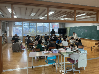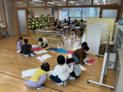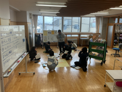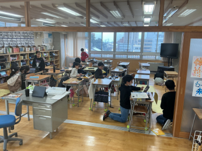 校舎の中は、あったか快適空間です。1年2組は、今日も熱心にすごろくづくりです。友だちと楽しそうにすごろくをやっている様子も見られました。