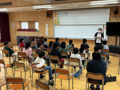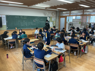 4年生の外国語です。火曜日なので、ALTのH先生も加わって「How many?」の学習です。ペアで向かい合わせになって、質問役と回答役に分かれて学習していました。