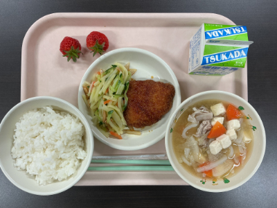 給食週間第2弾の献立は、「6年生が考えたささぐちランチパート1(ごはん、牛乳、とん汁、たれ米粉チキンカツ、アーモンド入りシャキシャキサラダ、いちご)」です。6年2組のYさんが、みんなが好きなメニューを取り入れながら考えてくれました。