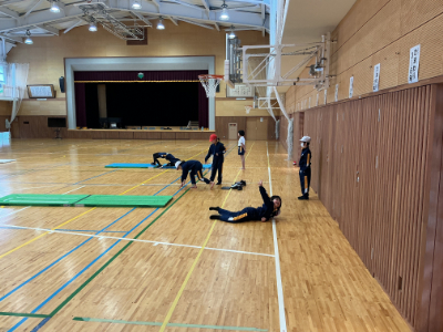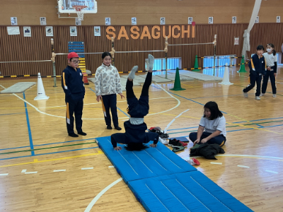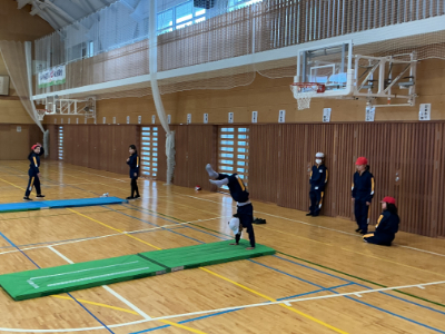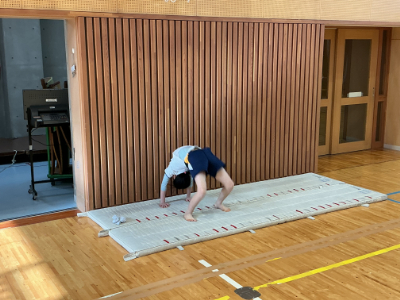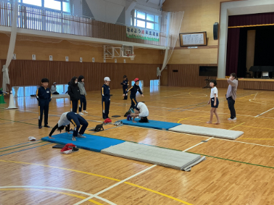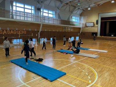 体があったまったら、マット運動です。先日動画で技のイメージをつくったので、今日は最初から様々な技に挑戦です。このように、体育館にはいくつもの場が準備されています。