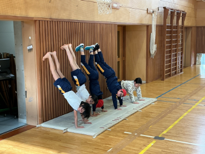 ここでは、みんなそろって倒立に挑戦していました。みんなで運動するとより楽しくなります。