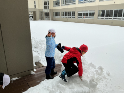 これだけ積雪があれば、当然子どもたちは雪遊びをしたくなります。足跡のない真新しい雪の中庭に、最初に足を踏み入れたのは、2年生でした!