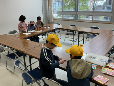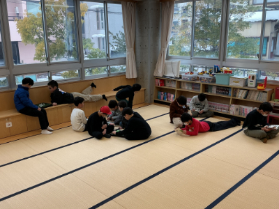 畳の部屋では、本を読んだりゆったりくつろぎながらおしゃべりをしたりしている子がいます。