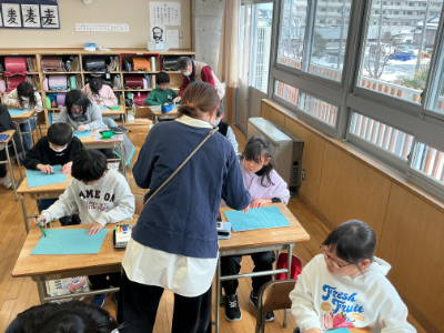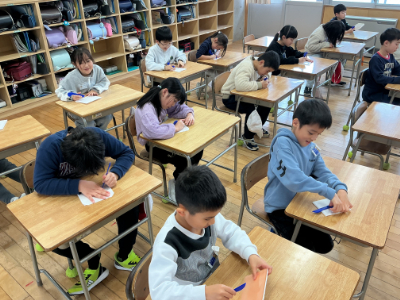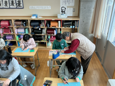 4年生は、木版画です。今日は彫り始めということで、地域のTさんを講師にお招きし、彫り方のコツを教えていただきました。Tさんは、毎年お正月の切り絵を作って寄贈してくださったり、笹口祭の大人ギャラリーにも多数作品を提供してくださっている達人です。