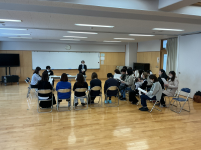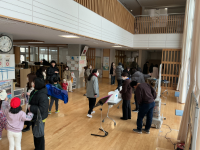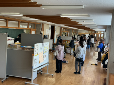 1・2年生のフロアですが、2年生は学級閉鎖中なので、1年生のみの授業参観です。教室の中にもたくさんの保護者の方がいらっしゃいます。保護者参加型の授業もありました。