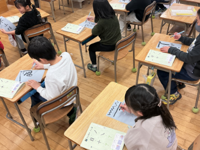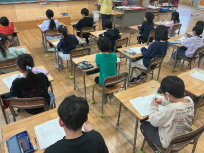 2年2組は、N先生の書写の学習です。水書き用紙に、筆を使って水でいろいろなものを書いていました。