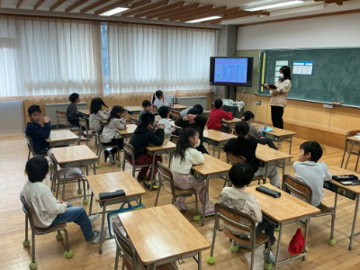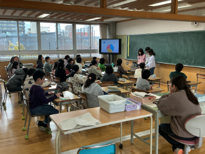 4年生は、国語で、グループで調べたことの発表です。学習や給食などについての意識調査をしてグラフなどに表して説明しているグループもあります。ICTを駆使して分かりやすく発表している様子が印象的でした。