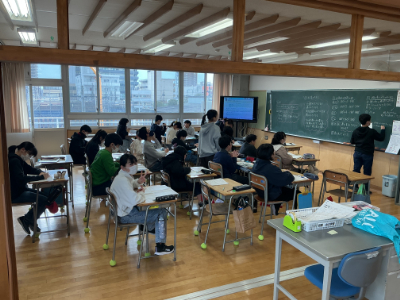 6年生は、算数のまとめが佳境を迎えています。代表の人が前に解答を書いて、みんなで意見交換をしたり先生が解説をしたりしていました。