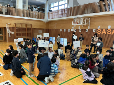 4年生によるクイズのコーナーです。ヒントをもとに、笹口小学校に関係する人や物などを答えるクイズです。先生かと思って回答したら、何と、答えは、モルモットのパコちゃんです。なかなかいい問題です。