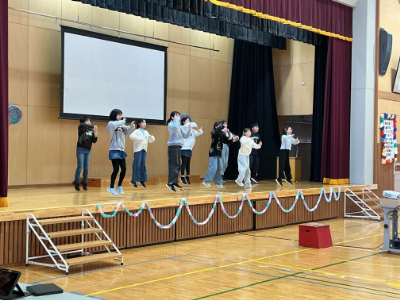 そして最後は6年生が会場に飛び出し、「カリスマックス」のダンスです。2年生はかわいいダンスでしたが、6年生はかっこいいダンスです。在校生も一緒にノリノリで踊っていました。パフォーマンスが終わると、「アンコール!」の大合唱。6年生がもう1回「カリスマックス」を踊ってくれました。