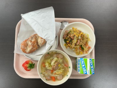 そして今日の給食は、6年生リクエスト給食(アーモンド米粉あげパン・ポトフ・りっちゃんのサラダ、いちご、牛乳)です。「小学校最後のあげパン」をしみじみと食べる6年生の姿がありました。